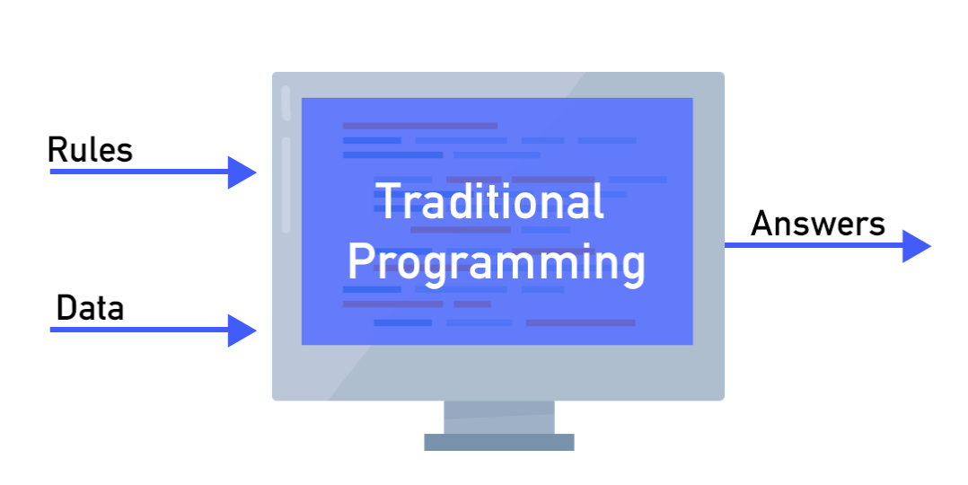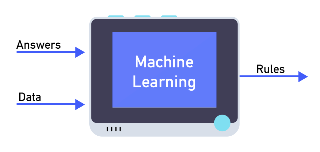 In the ML approach, we have data and a result (answers) but — unlike the traditional approach — we do not have a formula (rules) connecting them.